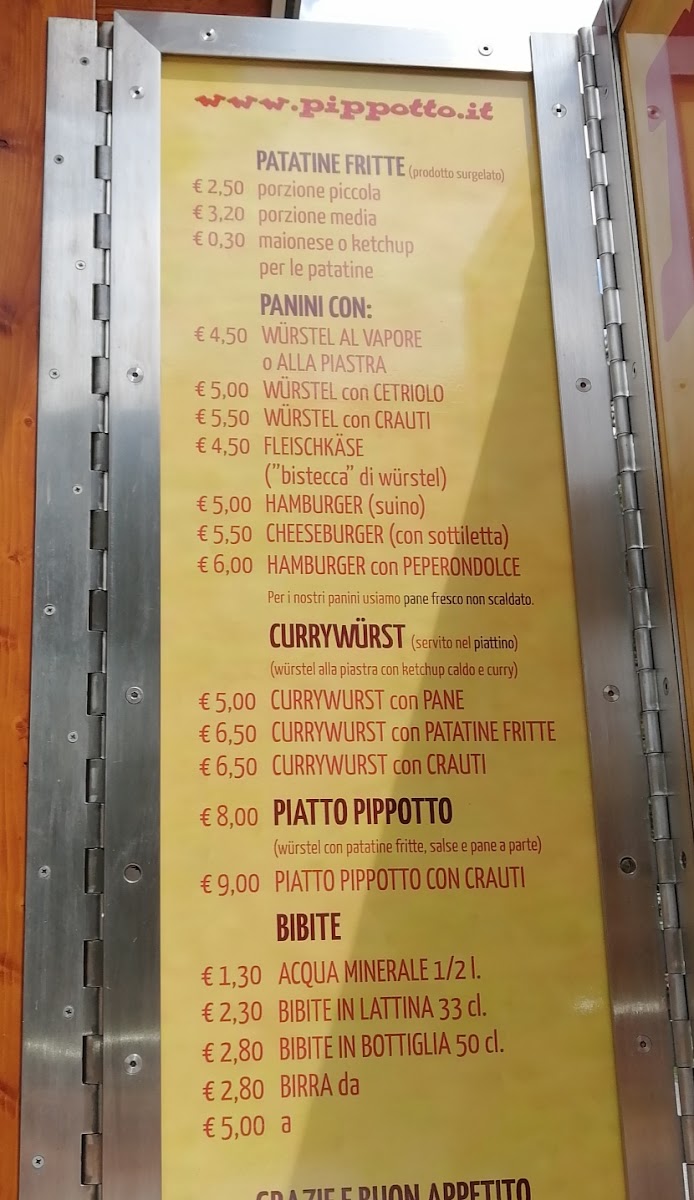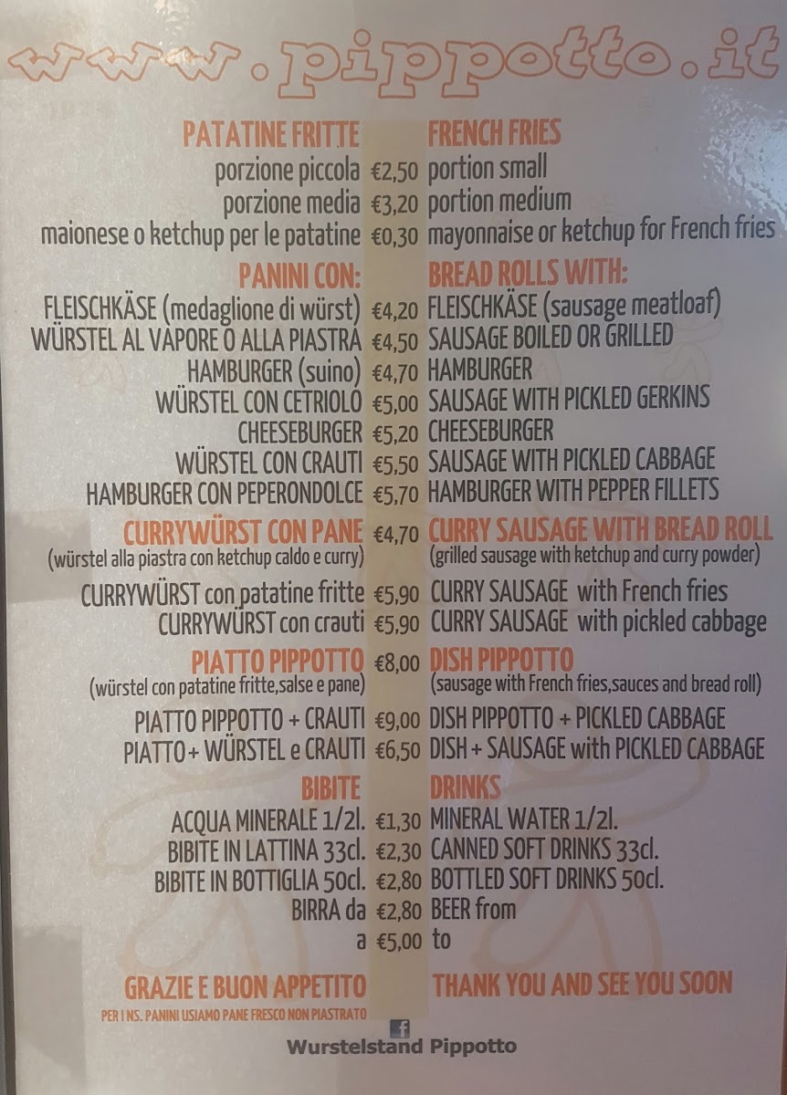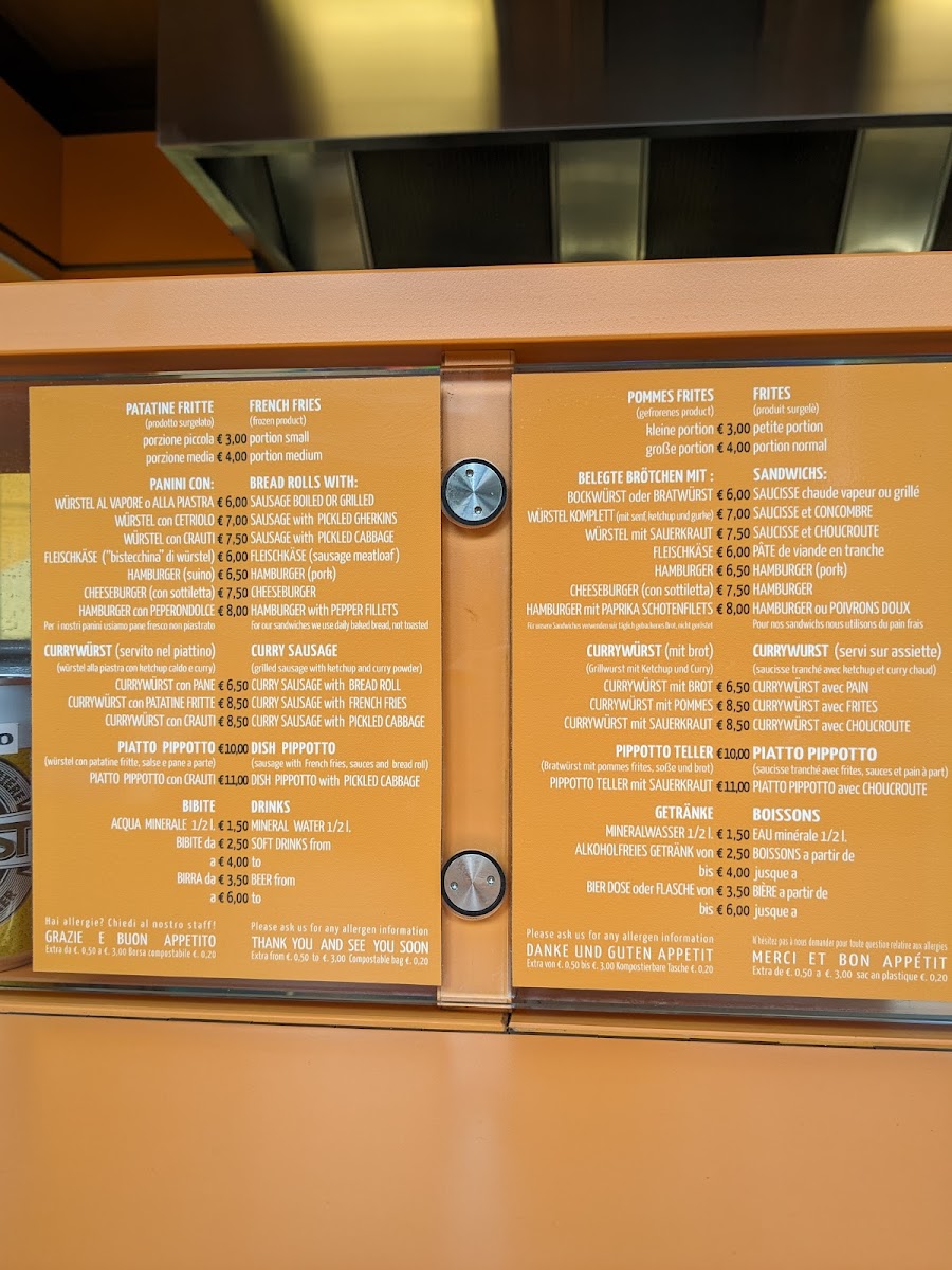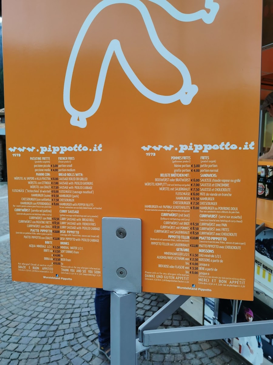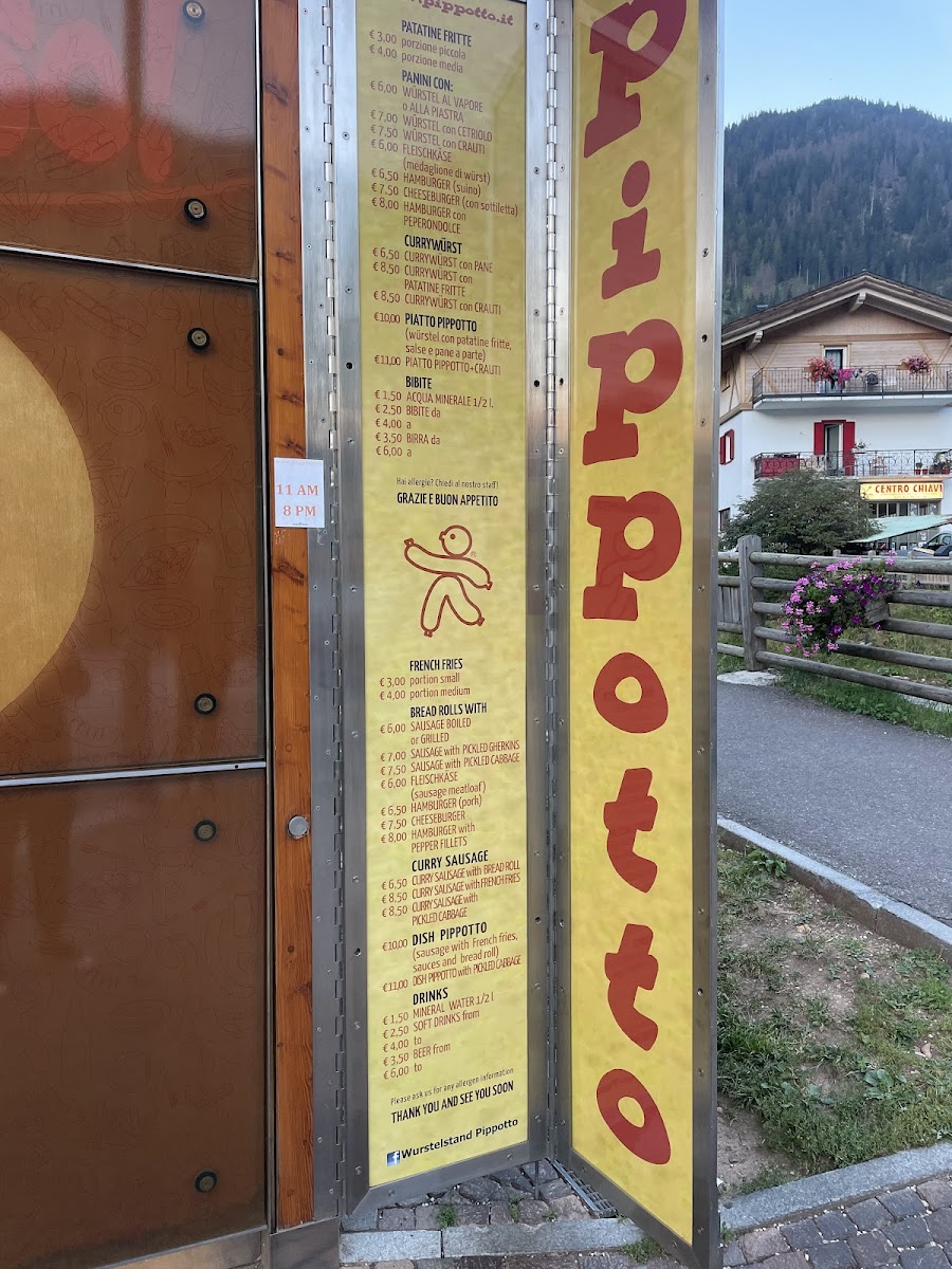 The menu at Wurstelstand Pippotto offers a delightful selection of tasty and satisfying options, perfect for anyone craving a quick bite in Canazei. One of the standout items is the Panino Pippotto, a savory sandwich that brings together rich flavors in a comforting package. For those who enjoy a bit of spice, the Currywurst Mit Pommes is a must-try, with its German-style sausage paired with crispy fries and a flavorful curry sauce that adds a zesty kick. Alongside these, the classic Patatine Fritte Con Maionese provides a generous portion of golden, crispy fries served with creamy mayonnaise, making it an ideal side dish or snack. If you prefer a tangy twist, the Patatine Fritte Con Ketchup offers a simple yet satisfying option with a sweet and tangy ketchup dip. Each of these dishes reflects the restaurant's commitment to delivering hearty, flavorful meals that are both comforting and delicious, ensuring a great experience for visitors.